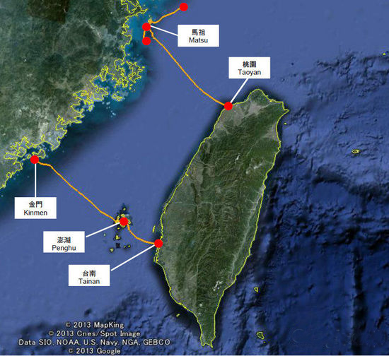 該項(xiàng)目主要分為2個(gè)部分:(1)從臺灣北部的桃園到跨越臺灣海峽的馬祖。(2)從臺灣南部的臺南經(jīng)由澎湖再到跨越臺灣海峽的金門。兩條光纜全長約為510公里,預(yù)計(jì)13個(gè)月竣工。