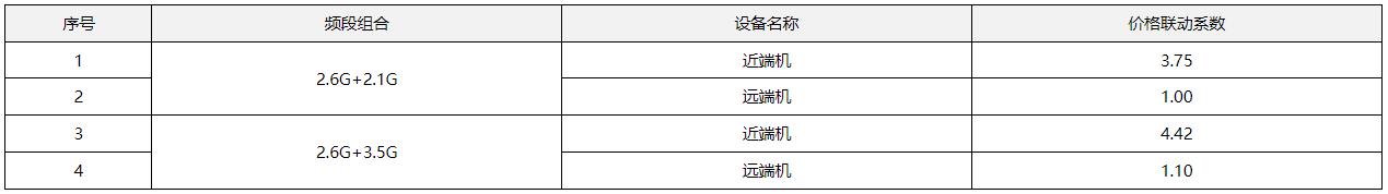 此外,本項目針對基準(zhǔn)產(chǎn)品(2.6G+2.1G遠(yuǎn)端機)設(shè)置了最高投標(biāo)限價,為84.56元/臺(不含稅)。其他型號的價格聯(lián)動系數(shù)詳見下表。若投標(biāo)人的報價高于最高投標(biāo)限價,其投標(biāo)將被直接否決。
