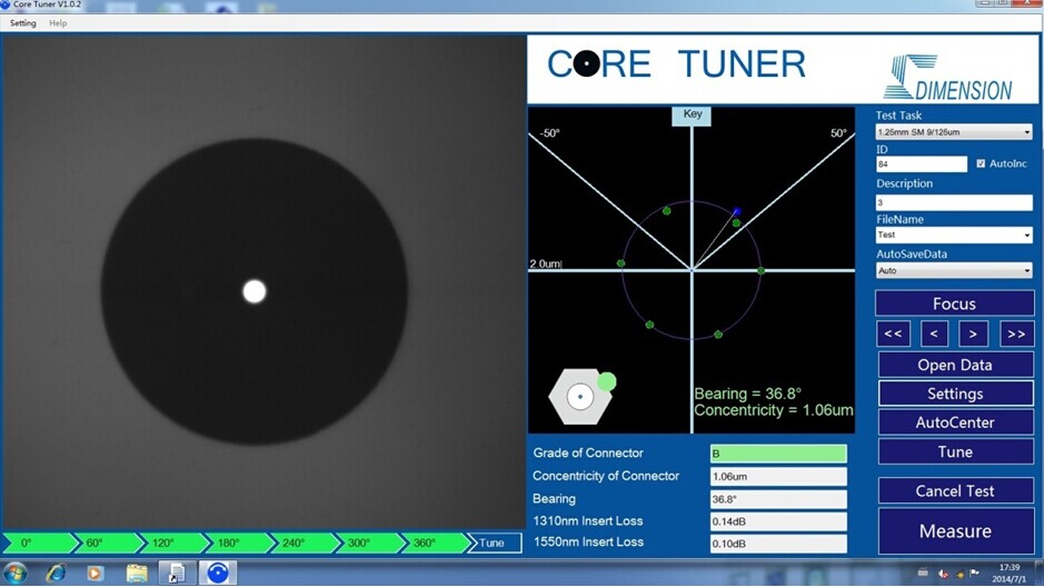 Core Tuner的測量原理是將光纖連接器纖芯注入光,每旋轉(zhuǎn)一定角度( 2 . 5 M M插芯9 0度,1 . 2 5 M M插芯6 0度)測量一次光線連接器纖芯的位置,經(jīng)過一個圓周的測量后計算出光纖連接器纖芯的同芯度和方向角Bearing。
