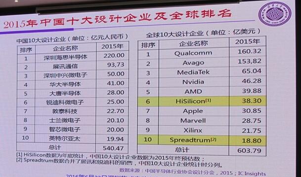 市場(chǎng)研究機(jī)構(gòu)IC Insights的數(shù)據(jù)顯示,2015年世界十大芯片設(shè)計(jì)公司中,中國(guó)的海思和展訊位居第6和第10位,分別是38.3億美元和18.8億美元。根據(jù)中國(guó)半導(dǎo)體行業(yè)協(xié)會(huì)設(shè)計(jì)分會(huì)的數(shù)據(jù),海思和展訊占據(jù)前兩名,第三至第五名分別是中興微電子、華大半導(dǎo)體、大唐半導(dǎo)體。