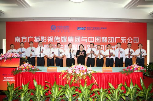 2009年10月15日上午,中國移動廣東公司與南方廣播影視傳媒集團(tuán)戰(zhàn)略框架合作簽約儀式在廣州舉行。雙方將秉持“相互信賴、共同發(fā)展、互利共贏”的原則,建立長期的戰(zhàn)略合作伙伴關(guān)系,攜手為客戶更加卓越的通信和信息服務(wù)。中國移動廣東公司總經(jīng)理徐龍、副總經(jīng)理劉堯根、總經(jīng)理助理丘文輝,南方廣播影視傳媒集團(tuán)黨委書記白玲、總裁張惠建等相關(guān)領(lǐng)導(dǎo)出席了簽約儀式。