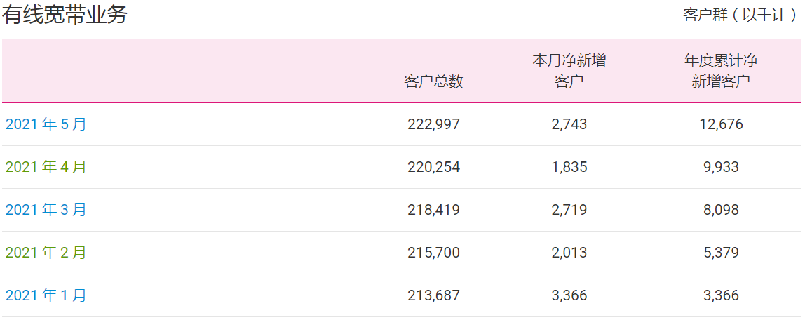有線寬帶業(yè)務(wù)方面,5月新增274.3萬(wàn)戶,累計(jì)客戶數(shù)達(dá)2.22997億戶。