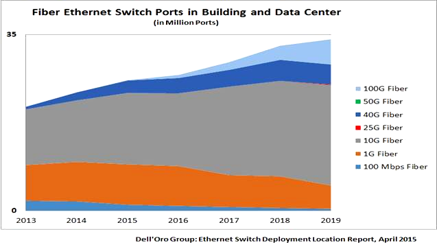 下圖1以太網(wǎng)端口趨勢的預測來自DELL,可以看到2016年100G的應用處于急速增長前的階段。