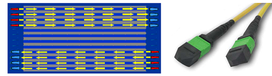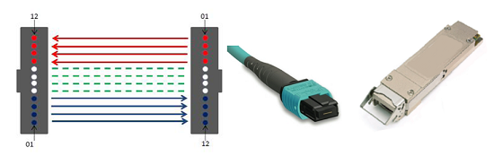 此應用模型符合新的標準IEEE802.3bm,該標準已經(jīng)于2015年正式發(fā)布。采用8芯多模光纖組成的4個通道并行傳輸。多模OM3與OM4光纖均支持100G應用,接口采用12芯MPO接口,其中中間4四芯光纖不啟用,每個通道支持25G,傳輸模型與IEEE802.3ba中40GBase-SR4完全一致,收發(fā)器采用QSFP28,具體通道與接口如下圖3所示: