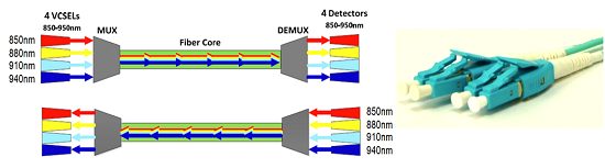 SWDM (Short Wavelength Division Multiplexing)是指短波段波分復用技術,在一芯多模光纖上傳輸4個波段的光信號。多模光纖中四個波段的窗口分別是850nm,880nm,910nm以及940nm。波分復用的原理與單模上的CWDM類似,而SWDM是首次將波分復用技術應用多模光纖短波段上,可以參考下圖4傳輸原理的模型。
