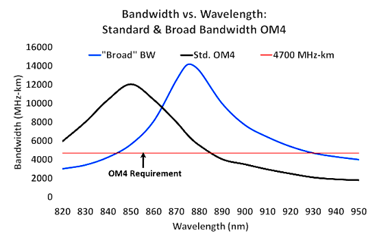 傳統(tǒng)OM3及OM4的多模光纖的主要傳輸窗口定義在850nm, 而如果采用SWDM技術則需要有四個窗口傳輸光信號,四個波段光源仍采用性價比高的VCSEL垂直腔面發(fā)射激光器。為了提高整體的帶寬,新一代多模光纖WBMMF(Wideband Multimode Fiber)的帶寬將有了新的提升,帶寬性能最高點處于大約在880nm波段附近且最高帶寬點高于傳統(tǒng)OM4多模光纖,參考下圖5關于傳統(tǒng)多模OM4光纖與WBMMF光纖的帶寬對比圖。