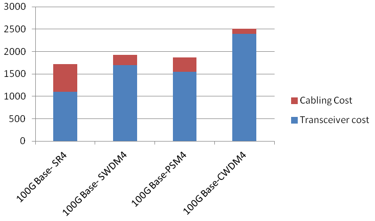 100GBase-PSM4基于單模光纖并行傳輸?shù)姆绞较啾容^多模應用距離至少達到500米,可以滿足98%數(shù)據(jù)中心主干的要求,與傳統(tǒng)單模收發(fā)器價格過高不同,基于PSM4技術的收發(fā)器價格差異不是很大,加上單模光纜比多模光纜價格更有優(yōu)勢,有源加無源總體系統(tǒng)價格還是具有一定的競爭力,特別是當主干米數(shù)平均長度超過300米的時候價格優(yōu)勢更能得到體現(xiàn)??傮w來看對于規(guī)模較大的數(shù)據(jù)中心主干長度有可能超過300米應用的數(shù)據(jù)中心來看,PSM4是具有應用前景的。但由于單模接口基于MTP/MPO的方式,光纖端面比較敏感,現(xiàn)場維護要求相對較高。預測PSM4在100G的市場中會取得一部分的機會特別對于大型數(shù)據(jù)中心或部分互連網(wǎng)IDC的用戶,但從更長遠來看,PSM4成本缺少較大幅度下降的基礎,預計PSM4比較難以成為主流。