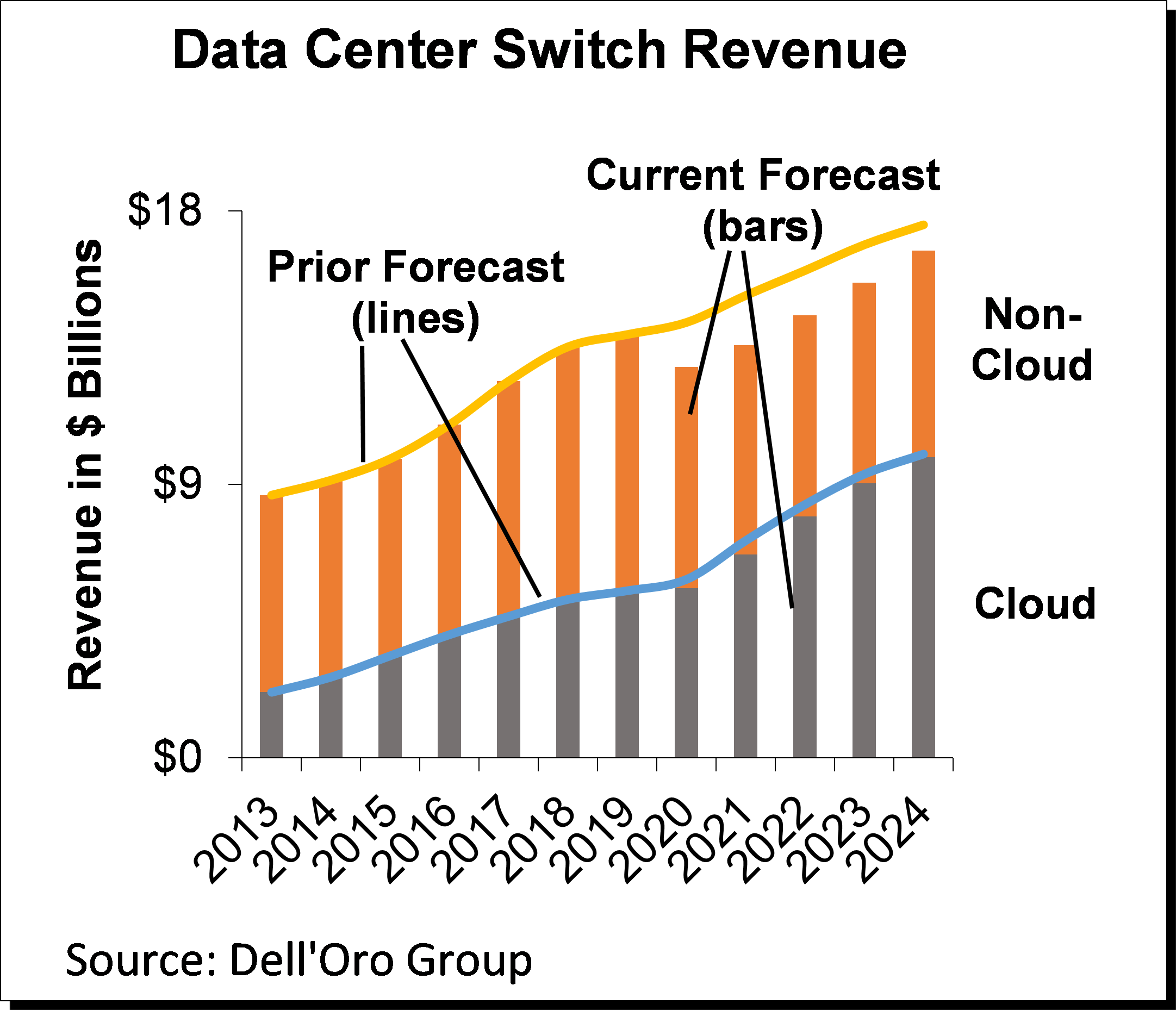 大部分向下調(diào)整是由非云業(yè)務(wù)驅(qū)動的,其中包括企業(yè)以及電信服務(wù)提供商(SP)。在預(yù)測期內(nèi),非云業(yè)務(wù)約占數(shù)據(jù)中心交換機(jī)總收入的60%,占每年向下調(diào)整的70%以上。同時,相對于圖表中所示的我們之前的1月份報告,我們對云細(xì)分市場的當(dāng)前預(yù)測顯示僅略有下調(diào)。Dell'Oro報告中云服務(wù)領(lǐng)域包括美國Top 4云服務(wù)提供商(谷歌、亞馬遜、微軟和Facebook),以及中國Top 3云服務(wù)提供商(阿里巴巴、騰訊和百度),以及其他Tier 2/3云服務(wù)提供商--它們大多是內(nèi)容云服務(wù)提供商。