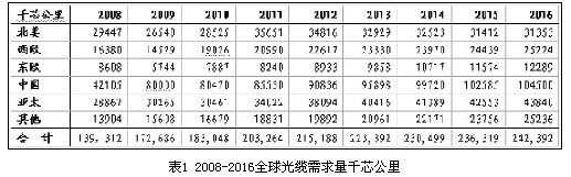 從拉動光纜需求的國家和地區(qū)分析:除北美地區(qū),其他地區(qū)的光纜需求量在2010至2016年均呈上升態(tài)勢。其中,東歐地區(qū)的年增長率保持在10%左右,為需求量增長最快地區(qū)。2010中國占全球光纜需求的44%。2011年占比有所下降,為42%,但中國仍是需求量最大的國家。預(yù)計(jì)2016年中國光纜需求將占全球市場的43%,需求超過1億芯公里(見圖1)。