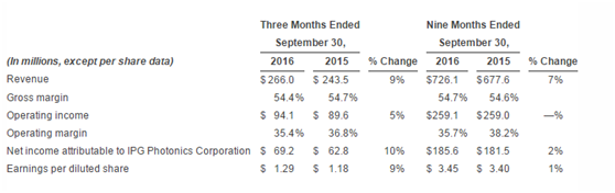 Iccsz訊(編輯:Aiur) 美國當(dāng)?shù)貢r間10月27日,納斯達(dá)克上市公司IPG光電公布了其截至9月30日的2016財年第三季度報告。報告披露IPG該季度營收2.66億美元(以下貨幣單位為美元),同比增長9%,毛利率54.4%,同比略減0.3%;營業(yè)利潤9410萬元,同比增長5%;IPG光電部門貢獻(xiàn)的凈收入為6920萬元,同比增長10%。
