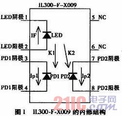 當(dāng)IL300-F-X009內(nèi)部的LED中流過(guò)電流IF時(shí),其所發(fā)出的光會(huì)在PD1和PD2中感應(yīng)出正比于LED發(fā)光強(qiáng)度的光電流Ip1和Ip2,其中IF、Ip1、Ip2滿足以下關(guān)系式: