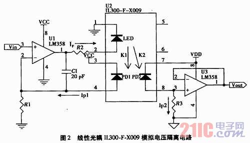 如圖2所示,IL300-F-X009的LED、PD1及運(yùn)放U1等組成隔離電路的輸入部分,PD2及運(yùn)放U2等組成隔離電路的輸出部分。隔離電路輸入電壓為Vin,輸出電壓為Vout,發(fā)光二極管LED上電流為IF,光敏二極管PD1上產(chǎn)生的電流為Ip1,光敏二極管PD2上產(chǎn)生的電流為而Ip2。