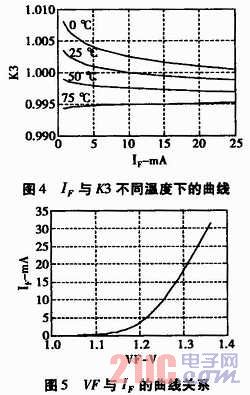 本試驗(yàn)選取VCC和VDD都為+5 V,但不共地的電源電壓,Vin的輸入電壓范圍0 V~5 V,Vout的輸出電壓范圍0 V~5 V,如圖2所示。根據(jù)IL300芯片手冊(cè)說(shuō)明,如圖4和圖5所示,可知,在環(huán)境溫度為25℃,流過(guò)IL300-F-X009內(nèi)的發(fā)光二極管LED的正向電流為IF=10 mA時(shí),其傳輸增益K3=1,發(fā)光二極管LED的正向電壓VF=1.25 V。設(shè)輸入電壓Vin=5 V,則第一級(jí)運(yùn)放LM358輸出的電壓V1=5 V,因此,由以上分析可以計(jì)算出R2的電阻值。