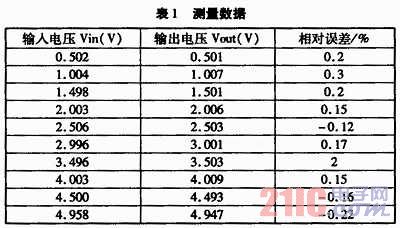 本文所設(shè)計(jì)的電壓檢測(cè)隔離電路用于對(duì)5 V以下電壓進(jìn)行檢測(cè)與隔離,通過(guò)多次實(shí)驗(yàn)比較,最后,選取R1=50 kΩ、R2=240 Ω和R3=50 kΩ,可在較大程度上提高檢測(cè)電路的精確性,此電壓檢測(cè)隔離電路基本實(shí)現(xiàn)了Vout與Vin相等。由表1可看出,相對(duì)誤差均在-0.5%~+0.5%范圍內(nèi)。通過(guò)實(shí)驗(yàn)測(cè)量數(shù)據(jù)可以發(fā)現(xiàn),線性光耦I(lǐng)L300-F-X009隔離電路有很好的穩(wěn)定性和線性。