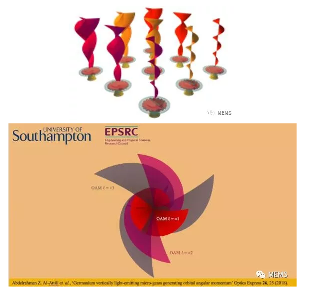 ICCSZ訊 據(jù)麥姆斯咨詢介紹,利用鍺(Ge)制成的微型齒輪已證明能夠產(chǎn)生具有軌道角動量(Orbital angular momentum, OAM)的“漩渦光”。這種新光源可大幅提高通過光學計算傳輸?shù)臄?shù)據(jù)量。
