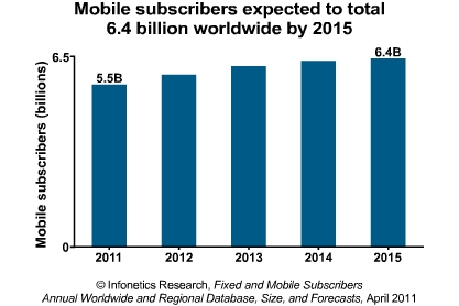 * 預(yù)計到2015年,全球移動電話用戶將增至64億(目前全球人口是69億);