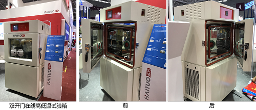 本次展會,節(jié)能降本是海拓儀器希望向業(yè)界客戶傳遞的理念,尤其是新產(chǎn)品雙開門在線高低溫試驗箱。傳統(tǒng)產(chǎn)品需要先升溫除霜再降溫,而新產(chǎn)品以創(chuàng)新性雙開門設(shè)計(前后開門)和首創(chuàng)操作孔設(shè)計,操作不開門,場地更節(jié)約,可長期在線低溫運行,測試箱內(nèi)無需除霜,還有雙視窗設(shè)計,使前后雙工位操作,很大程度提升生產(chǎn)測試效率。
