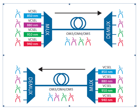 在這場競爭中,還有另一種收發(fā)器傳輸技術(shù),短波分復(fù)用(SWDM)收發(fā)器。與用于40G鏈路的BiDi類似,SWDM收發(fā)器僅需要一個(gè)兩芯LC雙工連接,不同的是SWDM每根光纖工作在850nm到940nm之間的4個(gè)不同的波長上,其中一根光纖專用于傳輸信號,另一根光纖專用于接收信號。