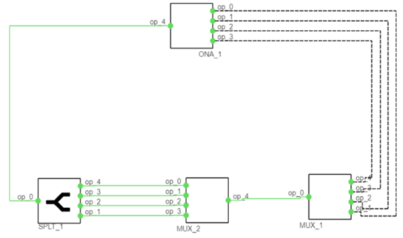 關(guān)于CWDM(解)復(fù)用器,利用pLogic搭建(解)復(fù)用器原理圖,如下圖所示,激光源用作從光網(wǎng)絡(luò)分析儀(ONA_1)的op_4端口發(fā)送的光源。分光器(SPLT_1)用于將激光源從一個(gè)端口分離到四個(gè)端口。四個(gè)激光源用作光源以發(fā)射到多路復(fù)用器(MUX_2)。解復(fù)用器(MUX_1)用于分離四個(gè)波長(zhǎng)。最后,使用四個(gè)ONA_1檢測(cè)器來(lái)檢測(cè)接收信號(hào)。