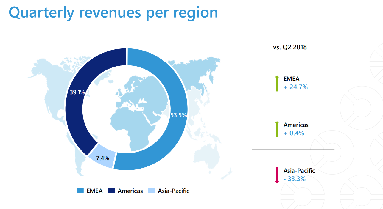 銷售收入1.33億歐元,同比增長7.6%,環(huán)比增長3.9%,符合公司之前的預(yù)期范圍(1.3-1.4億歐元)。毛利率34.9%,同比下滑1.8個百分點,環(huán)比下滑0.3個百分點。凈利潤129.7萬歐元,去年同期凈凈收益為457.7萬歐元,上個季度凈利潤103.6萬歐元。