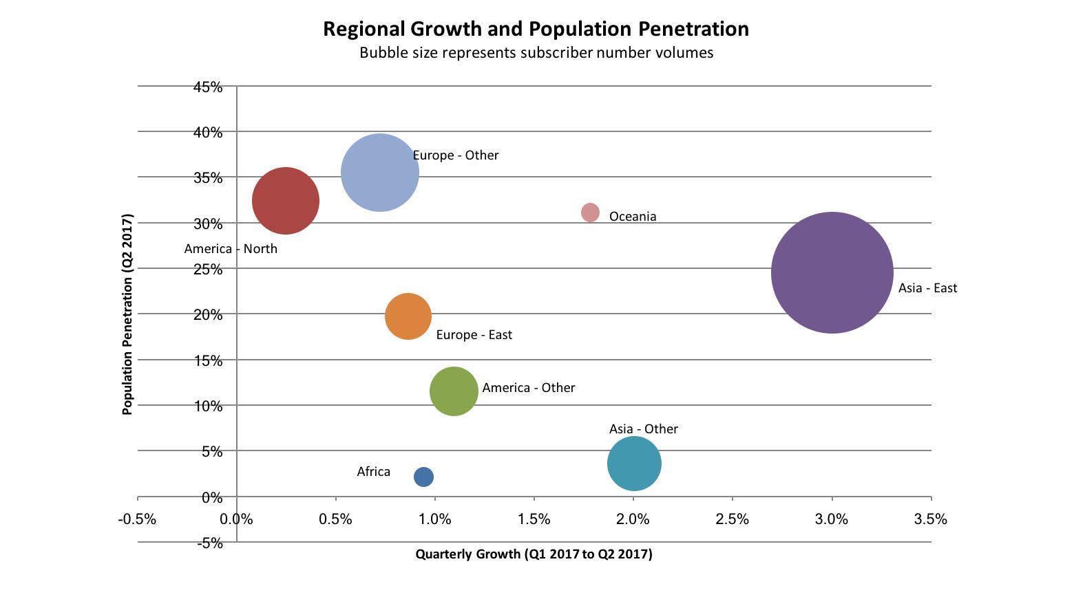 2017年第二季度,全球固定寬帶用戶增長了1.81%,與2017年第一季度相比,增長放緩,但高于2016年同期。