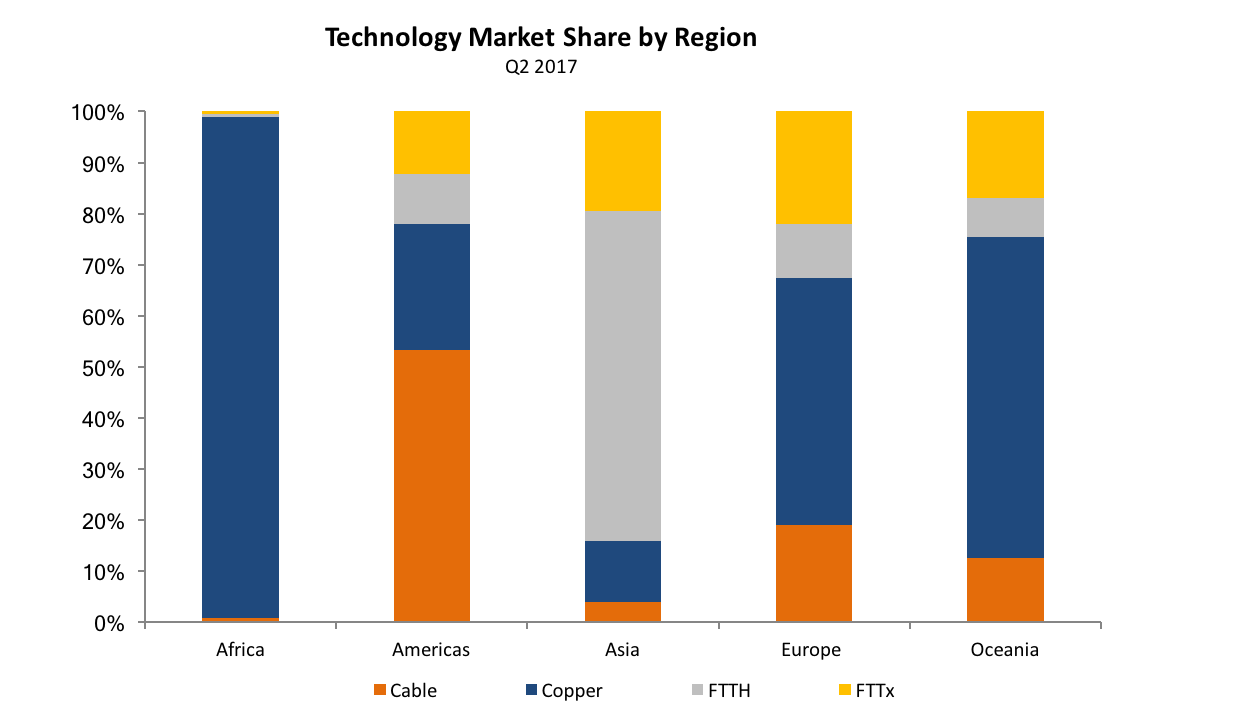 在所有地區(qū),以Copper為基礎(chǔ)的技術(shù)(DSL、ADSL和ADSL2+)的份額繼續(xù)下降。在2017年第二季度,在大洋洲和美洲尤其值得注意的是,VDSL在內(nèi)的FTTH和FTTx開始獲得更多的支持。在這兩個地區(qū),copper的份額分別下降了2.1%和1.5%(圖5)。