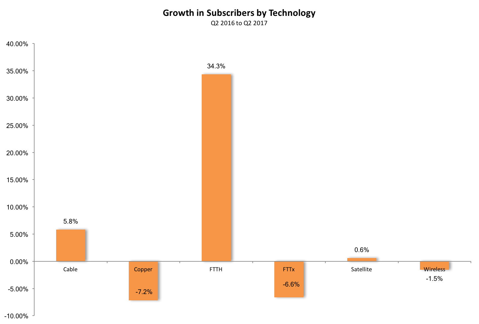 中國的固定寬帶用戶季度凈新增用戶數(shù)量也在全球范圍內(nèi)占據(jù)主導(dǎo)地位,主要是由大規(guī)模的FTTH推出。在2017年第二季度末的12個月里,中國增加了7100萬的FTTH連接。同時,季度凈增在2017年第二季度在美國只有20%,2017年一季度凈增加和略低于2016年第二季度,cable運(yùn)營商和市場等巨頭例如AT&T的增長顯著放緩。