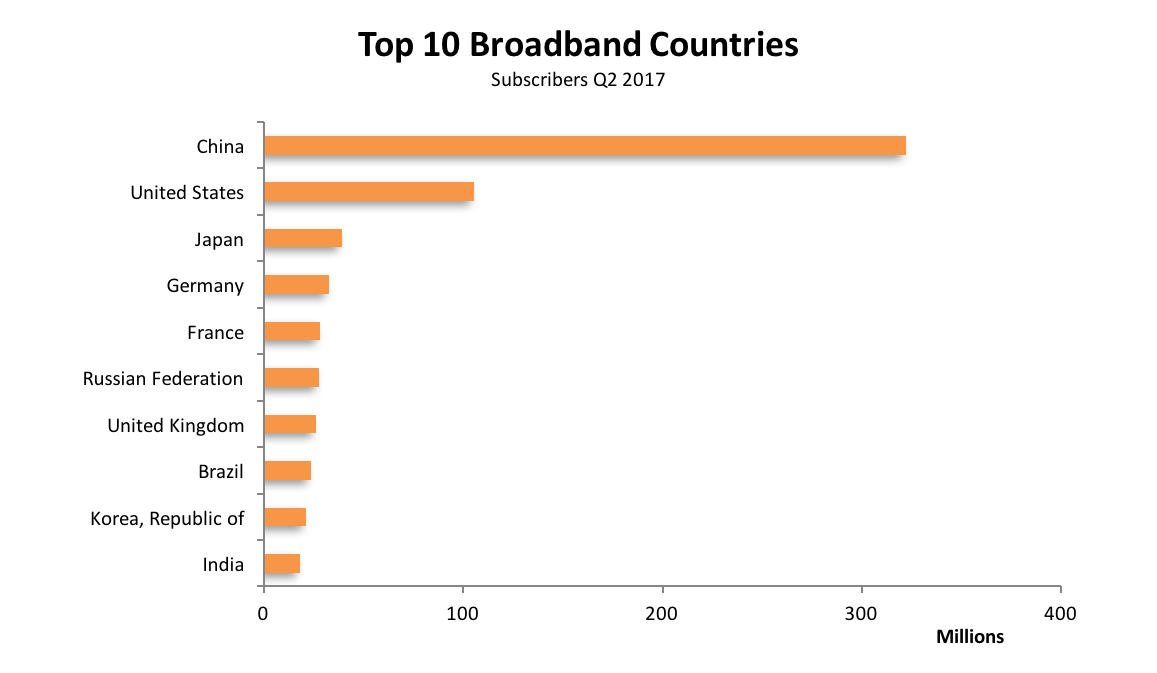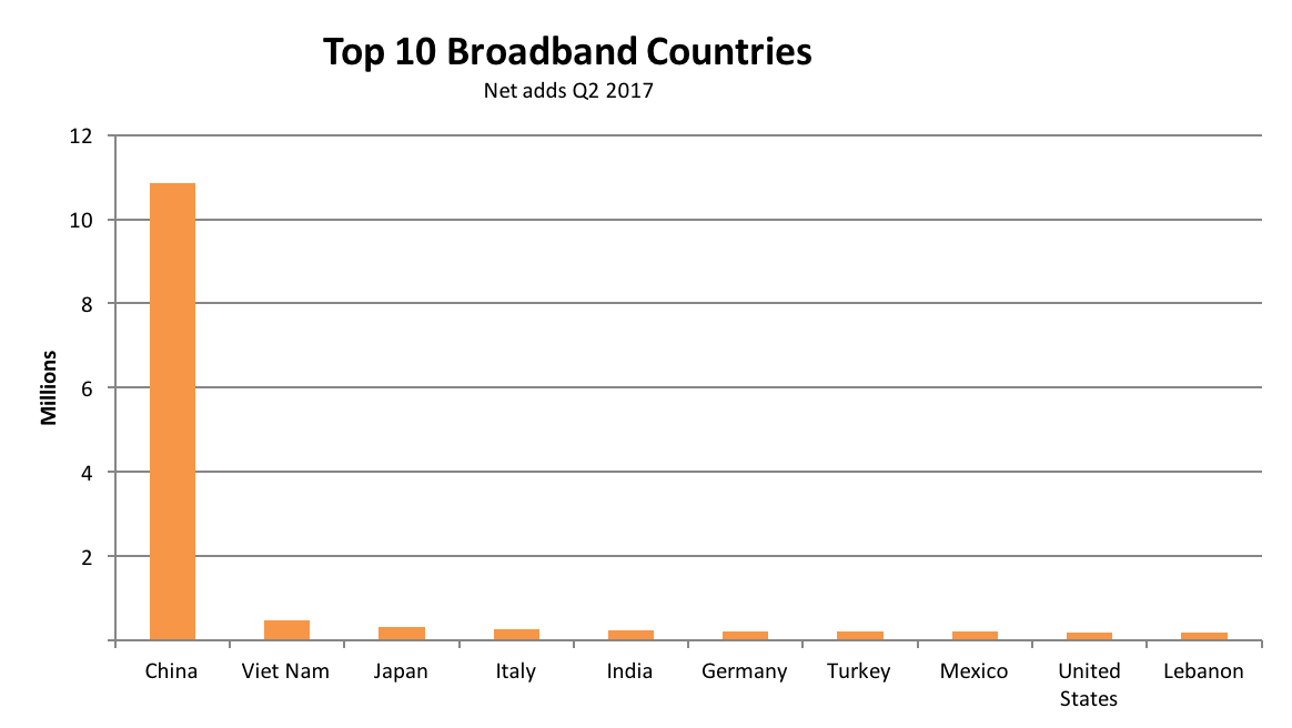 在截止到2017年第二季度末的12個月里,中國增加了100萬個FTTH連接,這個數(shù)值是印度和墨西哥的固定寬帶用戶總數(shù)的兩倍。