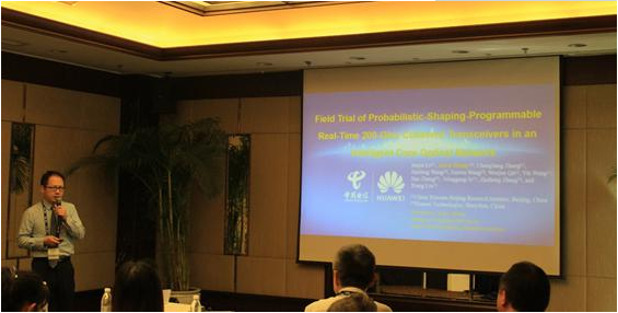 ICCSZ訊 近日,由中國電信聯(lián)合華為公司在現(xiàn)網(wǎng)完成了業(yè)界首次基于概率星座圖整形(PCS,Probability Constellation Shaping)技術(shù)的200G/400G超長距WDM傳輸商用設(shè)備的測試,實現(xiàn)了接近1200公里的無電中繼現(xiàn)網(wǎng)傳輸。基于本次現(xiàn)網(wǎng)測試(Field Trial)完成的學術(shù)論文《Field Trial of Probabilistic-Shaping-Programmable Real-Time 200-Gb/s Coherent Transceivers in an Intelligent Core Optical Network》被目前正在杭州召開的第十八屆亞太通信與光子學會議(ACP, Asia Communications and Photonics Conference)接收為會議的Post-deadline Paper(PDP)論文并作為光系統(tǒng)與網(wǎng)絡(luò)領(lǐng)域的第一篇論文進行宣講。ACP會議是目前亞太地區(qū)最具影響力的光通信與光子學學術(shù)性會議,學術(shù)會議的PDP論文則是最新研究成果的展示舞臺,該篇論文基于現(xiàn)網(wǎng)測試結(jié)果,內(nèi)容詳盡,具有較強的實用價值,并為未來應(yīng)用提供了較好預期。