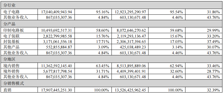 深南電路產(chǎn)品包括印刷電路板(PCB)業(yè)務、封裝基板業(yè)務、電子裝聯(lián)業(yè)務,2024年營收分別為104.94億元,、31.71億元和28.23億元。其中,在印刷電路板(PCB)業(yè)務收入同比增長29.99%,占公司營業(yè)總收入的58.6%;毛利率31.62%,同比增加5.07%。