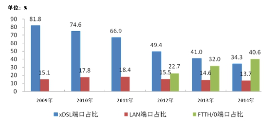 圖4-2 2009-2014年互聯(lián)網(wǎng)寬帶接入端口按技術(shù)類型占比情況