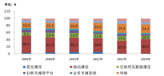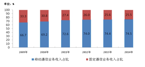 圖5-1 2009-2014年電信收入結(jié)構(gòu)(固定和移動)情況