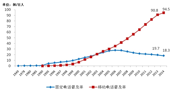 圖2-1 1949-2014年固定電話、移動電話用戶發(fā)展情況