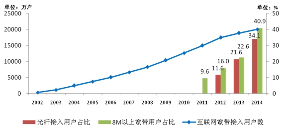 圖2-5 2002-2014年互聯(lián)網(wǎng)寬帶接入用戶發(fā)展和高速率用戶占比情況