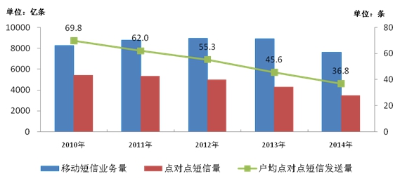 2014年,全國移動短信業(yè)務(wù)量7630.5億條,同比下降14.4%,降幅同比擴(kuò)大了13.8個百分點。其中,由移動用戶主動發(fā)起的點對點短信量同比下降18.9%,占移動短信業(yè)務(wù)量比重由上年的48.3%降至45.8%。月戶均點對點短信量連續(xù)五年持續(xù)下降,只有36.8條/月/戶。微信等新型即時消息類應(yīng)用對彩信業(yè)務(wù)替代作用進(jìn)一步加強(qiáng),彩信業(yè)務(wù)量只有647.4億條,由上年同比增長23%變成同比下降24.4%。移動短信業(yè)務(wù)收入同比下降14.7%,收入規(guī)模同比減少91.1億元。