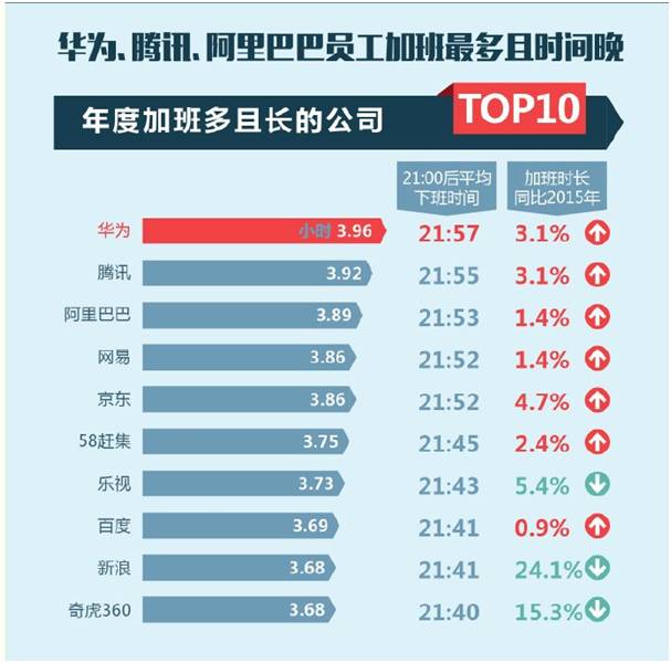 華為的加班文化,在圈內(nèi)外是早已有名。根據(jù)近日高德地圖聯(lián)合交通運(yùn)輸部科學(xué)研究院發(fā)布的《2016 年度中國(guó)主要城市交通分析報(bào)告》,華為是平均下班時(shí)間最晚的公司,直到 21:57分,每天加班時(shí)間接近4小時(shí),超過(guò)BAT等互聯(lián)網(wǎng)公司。