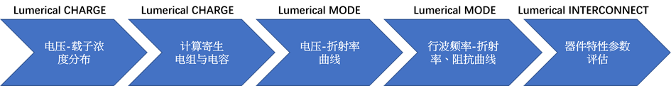 本案例首先以Ansys Lumerical的Multiphysics Charge模塊做電性仿真,項(xiàng)目包含幾種偏壓下參雜硅材料波導(dǎo)的載子濃度分布情況,以及考慮因結(jié)構(gòu)產(chǎn)生的寄生電容、阻抗等特性。接著將結(jié)果輸入Lumerical Mode模塊進(jìn)行接面二極管光纖特征仿真,包含電壓與等校折射率對(duì)應(yīng)曲線(xiàn),及射頻分析,其中載子濃度與折射率的關(guān)系結(jié)合Drude (Plasma)與半導(dǎo)體載子濃度模型,詳細(xì)請(qǐng)參考文獻(xiàn)2。最后把計(jì)算結(jié)過(guò)作為器件參數(shù),在Lumerical INTERCONNECT接口加入所需器件進(jìn)行電路仿真,計(jì)算相對(duì)相移、光傳輸、傳輸線(xiàn)帶寬和眼圖等結(jié)果。