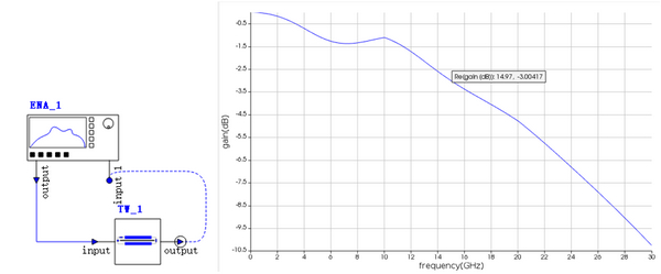 最后以Interconnect中的電網(wǎng)絡(luò)分析器(Electrical Network Analyzer ,ENA)對(duì)行波電極進(jìn)行帶寬分析。設(shè)定30GHz的頻率范圍,仿真電路如下左圖,而結(jié)果如下右圖,3db的帶寬約對(duì)應(yīng)15GHz。