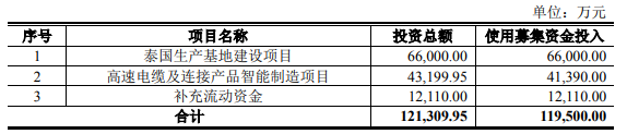 根據(jù)7月7日兆龍互連發(fā)布的向特定對(duì)象發(fā)行股票募集說(shuō)明書(shū)(修訂稿),本次擬向不超過(guò)35名特定對(duì)象發(fā)行股票不超過(guò)7786.85萬(wàn)股,所募資金總額不超過(guò)11.95億元,扣除發(fā)行費(fèi)用后將全部用于泰國(guó)生產(chǎn)基地建設(shè)項(xiàng)目、高速電纜及連接產(chǎn)品智能制造項(xiàng)目及補(bǔ)充流動(dòng)資金。