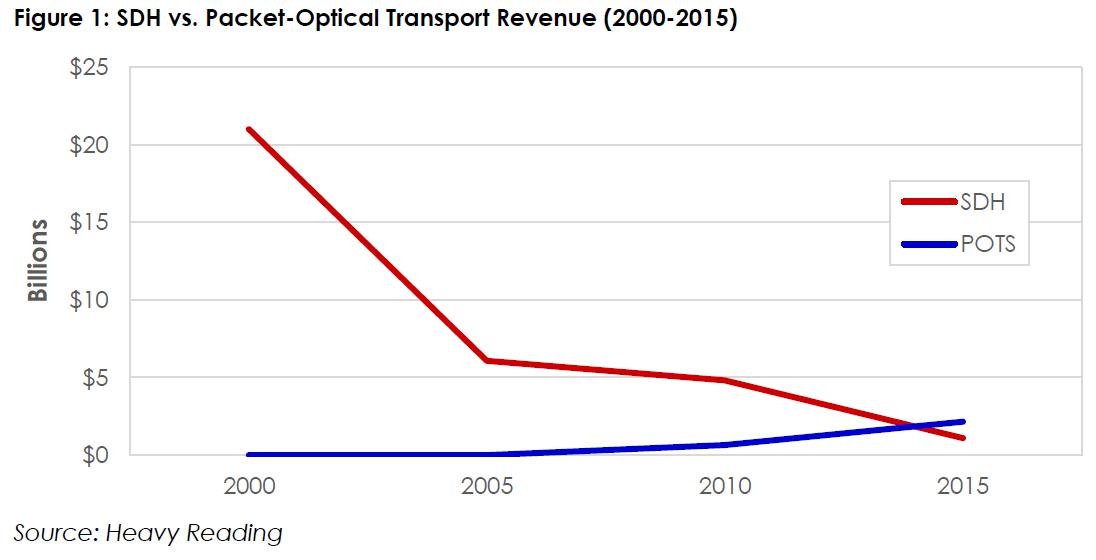 根據(jù)Heavy Reading的調(diào)查數(shù)據(jù),運(yùn)營商網(wǎng)絡(luò)中存在大量的老舊SDH設(shè)備,部分使用年限甚至已經(jīng)達(dá)到15年,存在嚴(yán)重老化的問題。同時(shí),由于SDH設(shè)備市場持續(xù)萎縮,截至2015年,全球SDH設(shè)備投資相比于2000年的峰值降低了95%。由于設(shè)備供應(yīng)商大幅削減SDH設(shè)備上的投資,導(dǎo)致老舊SDH設(shè)備的維護(hù)與更新非常困難。