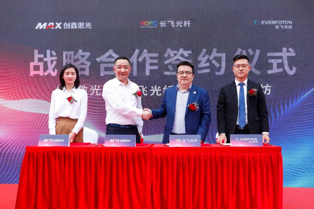 ICC訊 5月18日,長(zhǎng)飛光纖光纜股份有限公司(以下簡(jiǎn)稱“長(zhǎng)飛公司”,股票代碼601869.SH、06869.HK)及子公司長(zhǎng)飛光坊(武漢)科技有限公司(以下簡(jiǎn)稱“長(zhǎng)飛光坊”),與深圳市創(chuàng)鑫激光股份有限公司(以下簡(jiǎn)稱“創(chuàng)鑫激光”)在深圳簽署戰(zhàn)略合作協(xié)議。長(zhǎng)飛公司與創(chuàng)鑫激光在前期戰(zhàn)略合作的矚目成果下,繼續(xù)深化合作,旨在通過(guò)整合特種光纖與光纖激光器資源、協(xié)作分工與優(yōu)勢(shì)互補(bǔ),實(shí)現(xiàn)更高質(zhì)量、更深層次、更多維度的合作,共同迎接未來(lái)更具挑戰(zhàn)和期待的行業(yè)發(fā)展周期。長(zhǎng)飛公司執(zhí)行董事兼總裁莊丹、創(chuàng)鑫激光董事長(zhǎng)蔣峰、長(zhǎng)飛光坊副總經(jīng)理徐祖應(yīng)、武漢創(chuàng)鑫公司副總經(jīng)理吳琴及創(chuàng)鑫激光管理層出席儀式。