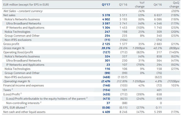 ICCSZ訊 諾基亞昨日發(fā)布了2017年第一季度業(yè)績報告。財報顯示,2017年第一季度諾基亞的凈銷售額同比下滑2%至53.8億歐元。非基于國際財務(wù)報告準則的凈銷售額同比下降4%至53.9億歐元。本季度諾基亞歸屬于母公司股東的虧損額收窄至4.73億歐元,去年同期的虧損額為6.23億歐元。