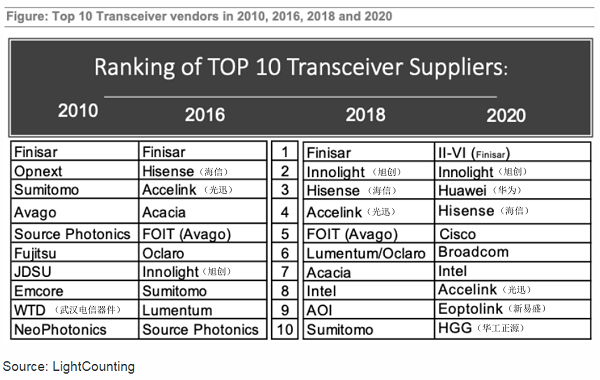 下圖說明了過去十年光模塊供應(yīng)商TOP10榜單的變化。到2020年,大多數(shù)日本和美國供應(yīng)商已退出該市場,而以旭創(chuàng)為代表的中國供應(yīng)商的排名有所提高。該名單現(xiàn)在包括思科,后者于2021年初完成了對Acacia的收購,幾年還完成了對Luxtera的收購?,F(xiàn)在也包括了華為,因為LC改變了將設(shè)備供應(yīng)商制造的模塊排除在其分析之外的政策。華為和中興目前是200G CFP2相干DWDM模塊的領(lǐng)先供應(yīng)商。中興通訊在2020年已經(jīng)接近前十,而且很有可能在2021年進入榜單。