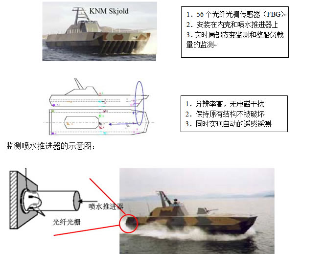 1999年春,美國海軍研究實驗室(Naval Research Laboratory, NRL)光纖靈巧結(jié)構(gòu)部的Michael Todd等人用光纖傳感系統(tǒng)對KNM Skjold 快速巡邏艇進行智能監(jiān)測。