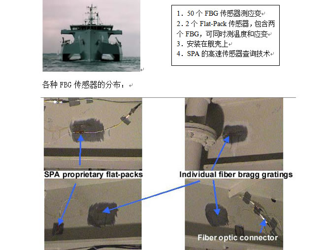 2002,2 美國海軍研究中心(Navy office of Naval Research)和海上戰(zhàn)爭中心(Naval Surface Warfare Center, Carderock Division)在英國皇家RV Triton艦船上安裝了光纖傳感系統(tǒng)對其進行艦船結(jié)構(gòu)健康監(jiān)測。SPA安裝了自己的艦船監(jiān)測系統(tǒng)和超過50個FBG傳感器安裝在艦殼上,同時存在電傳感器以驗證它的精度和性能。這個測試系統(tǒng)伴隨RV Triton在海上2個星期的海上航行測試,最后數(shù)據(jù)被NSWCCD 和 SPA分析,以指導RV Triton的工程改進。同時美國也非常有興趣將該傳感系統(tǒng)用在Trimaran(三艦并列)技術(shù)的發(fā)展中。