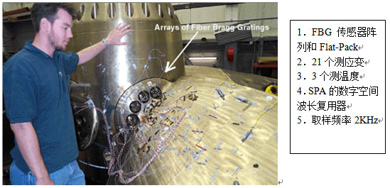 美國海軍水面戰(zhàn)斗中心Naval Surface Warfare Center,Carderock Division在登陸平臺船塢LPD17上的艦船推進器上完成了光纖傳感系統(tǒng),其中包使用了FBG傳感器陣列和Flat-Pack,具有高速和高傳感器密度的功能特點,同時運用了SPA的基于高速傳感器查詢系統(tǒng)的數(shù)字空間波長復用器。為了驗證這個推進器的設(shè)計,4個通道24個傳感器被用于測試,21個應(yīng)變傳感器,3個溫度傳感器,取樣頻率2KHz。