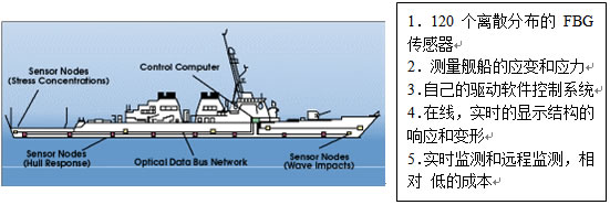 1999,10 在美國海軍實驗室的資助下,Systems Planning and Analysis Inc.制作了一個低成本的,用于監(jiān)測美國海軍艦船的結(jié)構(gòu)和理性的光纖網(wǎng)絡(luò)。在這個系統(tǒng)中,通過分布在艦船外殼上的傳感點,可以實時的計算和報告艦船在海洋中作業(yè)時的受力情況。這個遠程監(jiān)測技術(shù)能夠為艦船的設(shè)計的修改和升級提供指導,同時對艦船的完整性有預警功能。