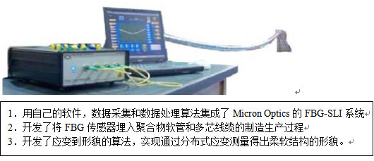 目前,聲納傳感器已被各國海軍特別關(guān)注。在實際應(yīng)用中,拖拽聲納陣列是由一串包含有水聽器的模塊組成的,其中水聽器可以確定水下噪聲源的位置。這樣每個聲納模塊相對聲音噪聲的位置決定了辨別噪聲源的準確性。電子傳感器雖然已經(jīng)在上面領(lǐng)域被應(yīng)用,但由于其自身存在的問題,這樣隨著全光纖拖拽聲納系統(tǒng)的發(fā)展,用一個光的方法來精確的測量陣列上的各個水聽器的位置就顯得非常的必要。Fiber Bragg grating(FBG)傳感器對于這種需要分布式形貌測量的應(yīng)用是非常的理想的。SPA已經(jīng)用FBG傳感器開發(fā)了一個相對成本低的,光拖拽陣列形貌和位置測量系統(tǒng),克服了許多當前的缺點。用軟硬件相結(jié)合的方法實時的分解和顯示了陣列和柔軟結(jié)構(gòu)的變形。同時這個系統(tǒng)是基于Micron Optics的FBG解調(diào)系統(tǒng)的。