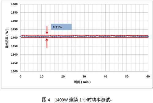 為驗(yàn)證長(zhǎng)飛20/400光纖更高功率的穩(wěn)定性,測(cè)試人員增加了一組1400W的穩(wěn)定性測(cè)試實(shí)驗(yàn)。測(cè)試結(jié)果顯示,長(zhǎng)飛20/400光纖1小時(shí)內(nèi)功率波動(dòng)值在0.21%,如圖4。
