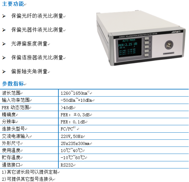 據(jù)上海嘉慧介紹,JW8605偏振消光比測試儀是用于保偏器件的偏振消光比(PER)檢測、光源的偏振度檢測、保偏光纖消光比檢測和其他保偏器件檢測的專業(yè)設(shè)備。